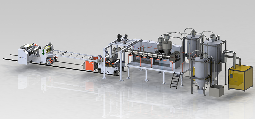 PET單螺桿(結晶干燥)、APETG、PETG、CPET 單層及多層共擠片材生產(chǎn)線是目前國內技術先進、工藝成熟、設備穩(wěn)定的片材生產(chǎn)線之一,與國內同類設備相比,綜合效能提高30%; 只需要結晶不需要干燥,是金韋爾公司新研制的高品質PET片材機組,其優(yōu)點:低能耗、工藝簡單、設備使用維護方便等特點。
